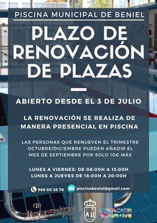 Para llevar a cabo la renovación de plazas acude al mostrador de piscina en el horario de atención: de lunes a viernes de 08:00h a 13:00h y de lunes a jueves de 18:00h a 20:00h. Puedes solicitar más información o resolver dudas concretas contactando, en el mismo horario, con el teléfono de la Piscina Municipal, 968 60 28 76. También a través del correo piscinabeniel@gmail.com.